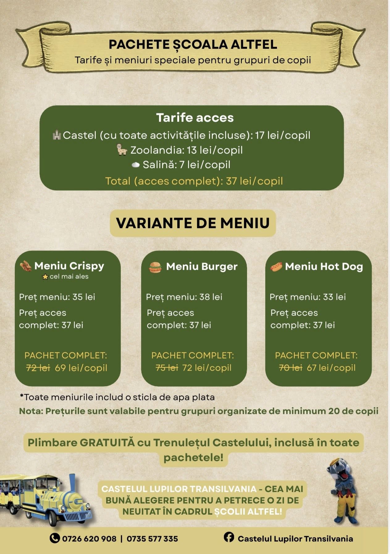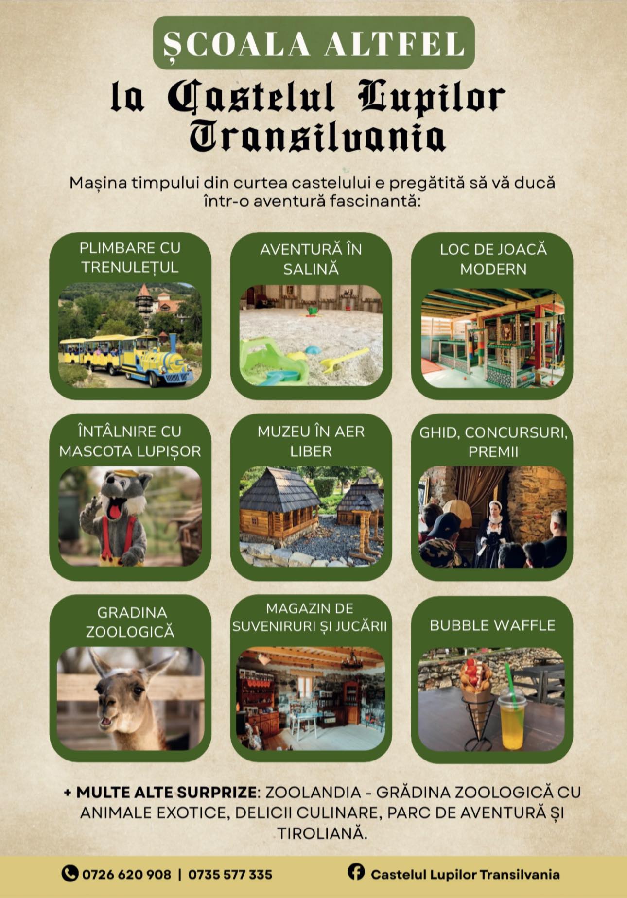Școala Altfel la Castelul Lupilor Transilvania Noutăți martie 24, 2026 O destinație ideală pentru grădinițe, școli și licee, unde educația se îmbină cu distracția într-un cadru de poveste. Programul include: Plimbare cu trenulețul castelului Aventură în salină Vizită la Zoolandia – grădina zoologică Tur ghidat al castelului Satul tradițional în miniatură Covacia castelului Închisoarea maritală Loc de joacă generos Tobogan gonflabil Întâlnire cu mascota Lupișor Meniuri speciale pentru grupuri Activități adaptate pentru toate grupele de vârstă Pachete complete pentru o zi organizată fără stres pentru profesori Locație sigură, spațioasă și aproape de natură Chimindia, județul Hunedoara Rezervări grupuri: 0726 620 908 | 0735 577 335 Recomandăm rezervarea din timp. Share: